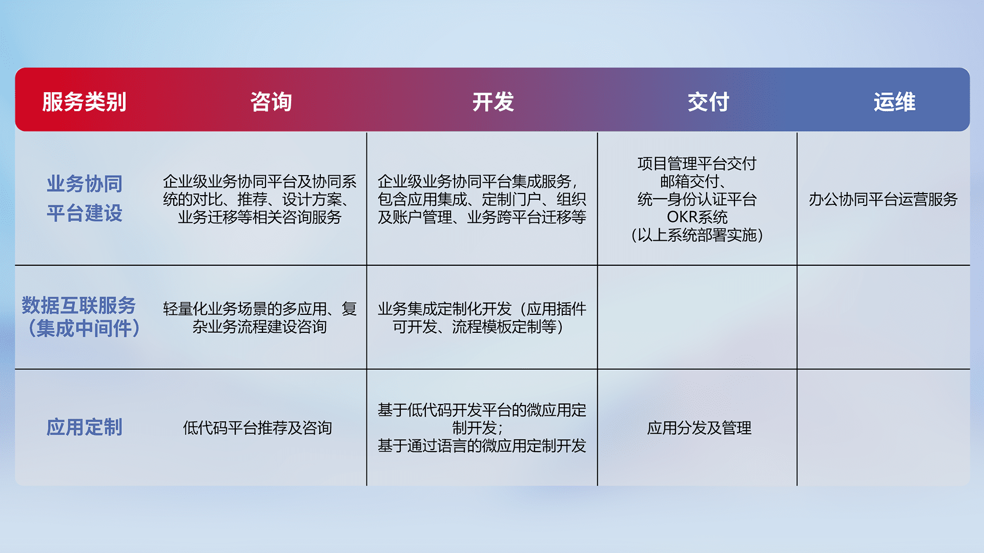 针对钉钉、、、、企微、、、、IDaas等平台级产品提供产品的规划、、、方案、、、交付、、、、定制化开发等服务,,,实现如统一协同办公、、智能客户服务、、混合会议管理、、、智能数据查询、、、、等业务场景,,实现数字化转型。。